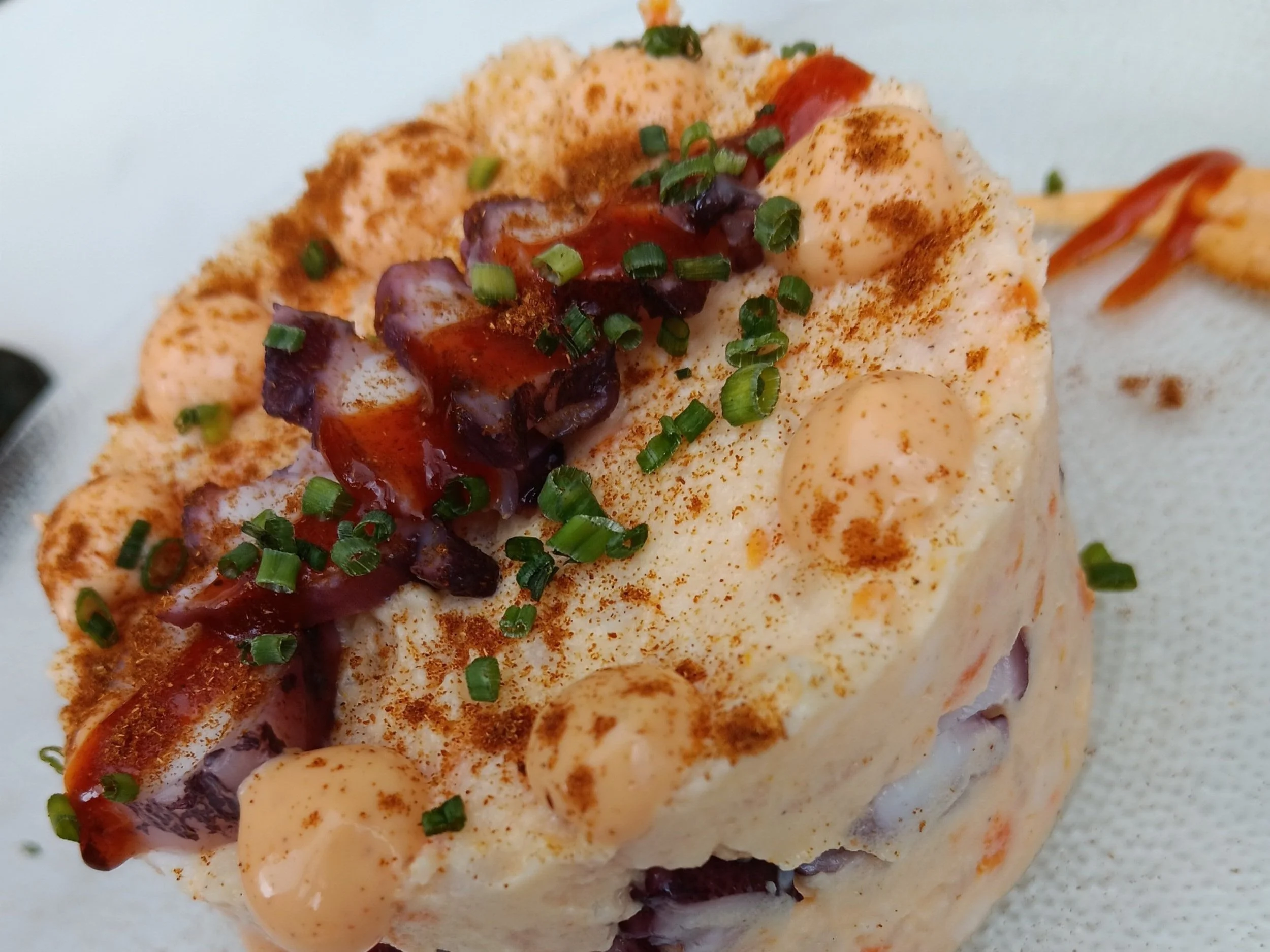 A quick-start guid in case you’re reading this just as you’ve arrived at a Jerez bar: get the carrilladas (pork cheeks), or the albondigas (meat balls) or a montadito de ternera (veal sandwich) or the solomillo de iberico (pork steak) or the berenjenas (deep-fried eggplant) or the ensaladilla de gambas (prawn & potato salad) or the zanahorias aliñas (carrot salad in sherry vinegar) or the papas aliñas (potato salad, ditto) or the cazón adobo (monkfish nuggets), or one of the fritos options (deep-fried small fishies) … Most of these come in tapa form. At least once during your stay, order a racion of gambas ajillo (garlic prawns). A plate of queso or chorizo won’t hurt, either. Pictured at top is an ensalladilla pulpo (octopus salad), one of the occasional off-the-card specialities at Nuna. Their gambas (prawn) salad is just as good – we reckon the best in the city.