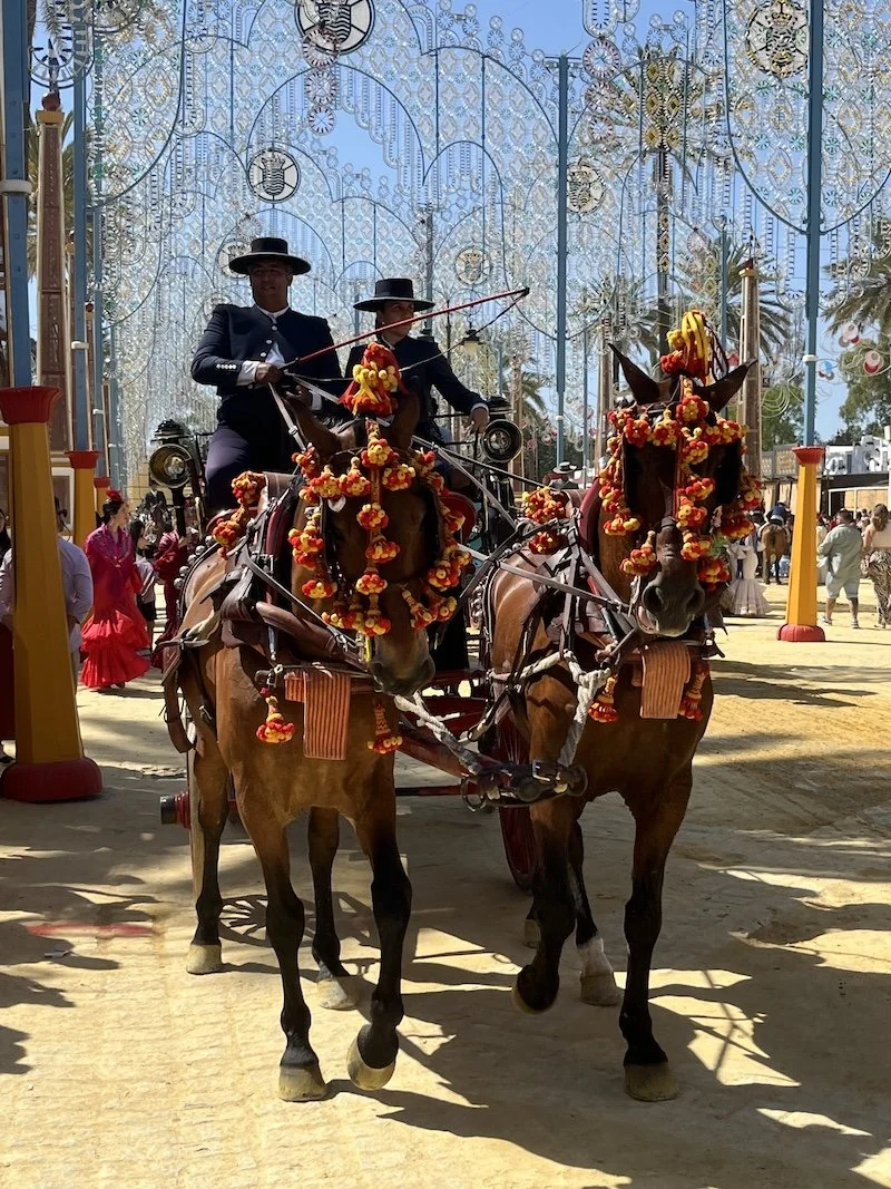 Through the guts of this pop-up movie set runs a veritable horse highway, an endless parade of caballeros and caballeras atop the finest steeds, graduates of the Royal Andalucían equestrian school that’s based a few blocks from our house. Expert riders and wagoners all, they’re here to show off Jerez’s hamazing horsey history. Everything has been brushed, shampoo’d and polished to within an inch of its life, then arranged into a proud ensemble of gypsy flare.